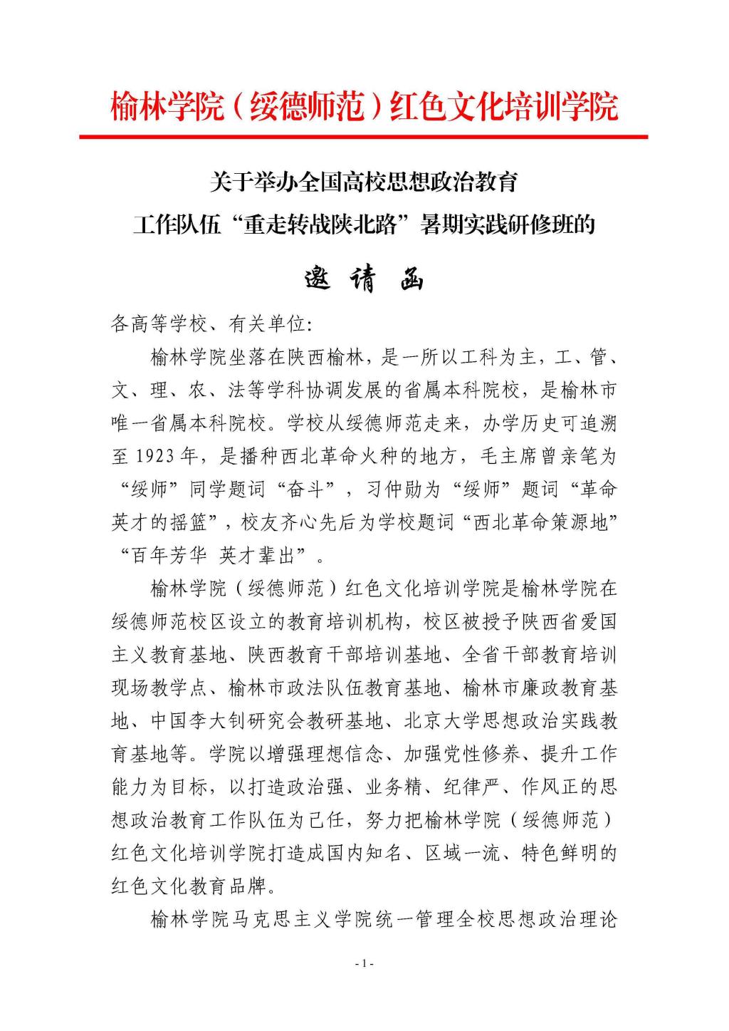 关于举办全国高校思想政治教育工作队伍“重走转战陕北路”暑期实践研修班的邀请函